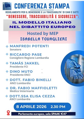 In occasione della conferenza stampa indetta a Bruxelles per il giorno 8 aprile nella sede del Parlamento Europeo, ENCI presenterà il Modello Italiano in merito al Regolamento per il benessere e la tracciabilità di cani e gatti.